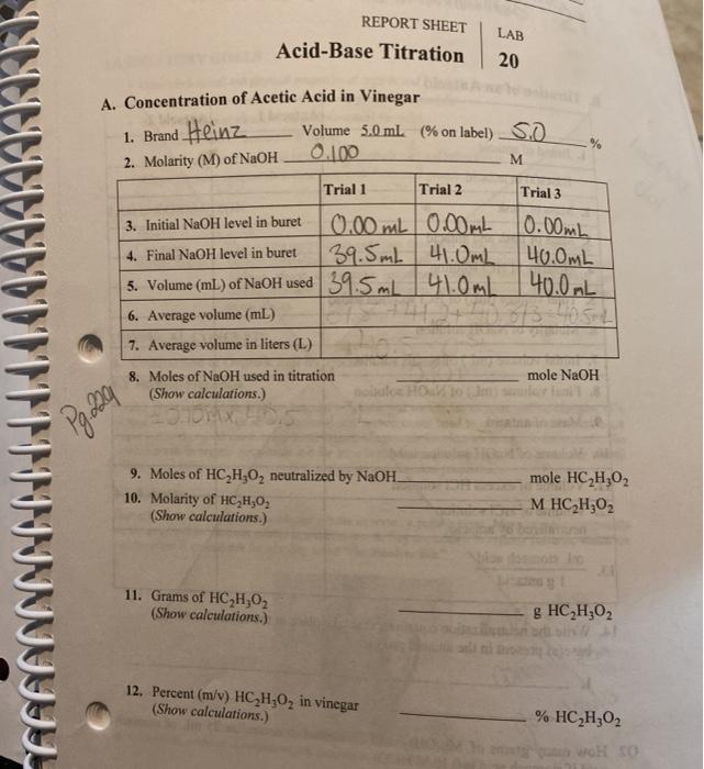 Solved Report Sheet Acid Base Titration Lab 20 1 Brand Chegg Com